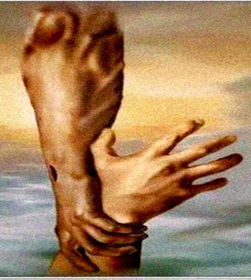 You see the veins and muscles start to come out in the Hand from where it is straining so hard to save you. A Voice comes stern but soft, and beckons you deeply to reach for Life. You start to sink faster as your lungs quickly fill.